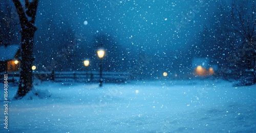 Winter scene. Snow falls upon quiet street. Lights glow warmly amidst darkness, creating peaceful ambiance. Cold weather prevails.