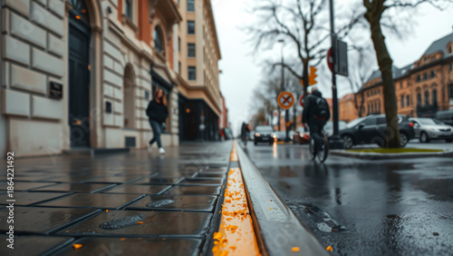 Regnerische Stadtstraße mit Spiegelungen in Pfützen im