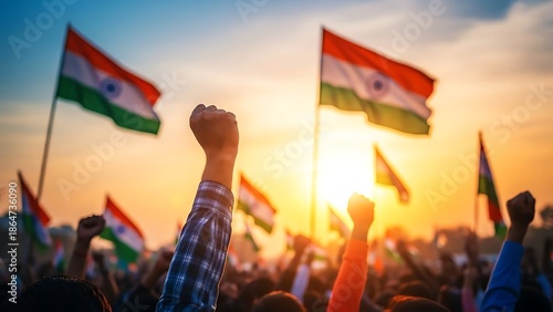 Indian flags waving at sunset during a vibrant public celebration