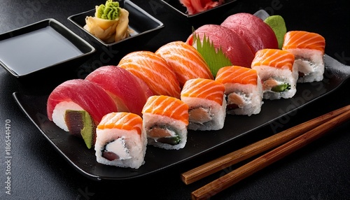 fresh assorted sushi rolls and nigiri with salmon and tuna on black plate