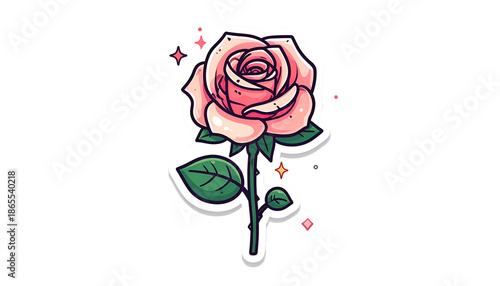 Cartoon style pink rose with detailed petals, stem, and leaves, set against a black backdrop