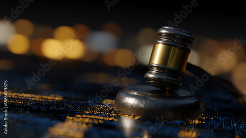 A close-up of a judge's gavel resting on a dark surface with blurred golden lights in the background, symbolizing law, justice, and legal authority