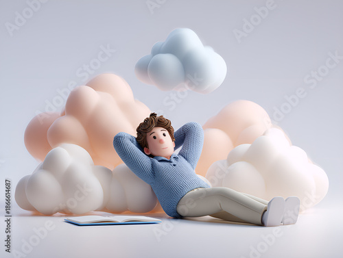 Relaksujący młody mężczyzna leży wśród miękkich chmur, spokojna scena 3d, odpoczynek i komfort w pastelowych kolorach.