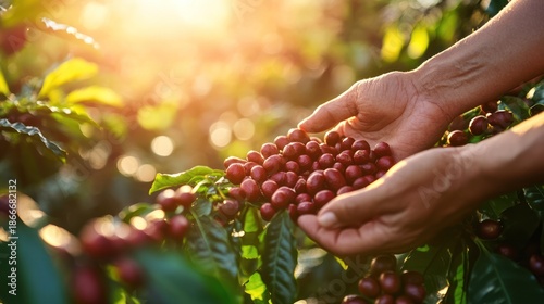 Hands gently harvesting ripe coffee cherries from a sun-drenched coffee plant, symbolizing the origin of premium coffee beans
