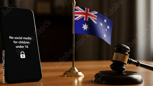 Smartphone, Australian flag and gavel – symbol of legislative action banning social media for children under 16