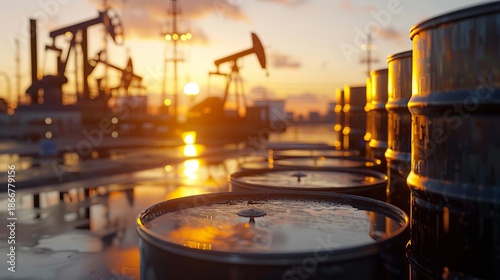 Industrial sunset striking visual of crude oil barrels illuminated by warm evening hues