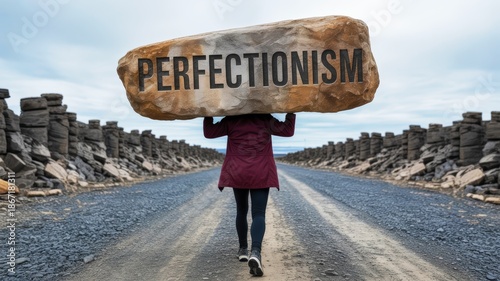 A person carries a large rock labeled "PERFECTIONISM" along a gravel path, symbolizing the weight and burden of striving for perfection.