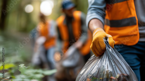 Faceless group of volunteers helping to keep nature clean by collecting garbage into plastic bag, environmental stewardship, ecological conservation work, outdoor cleanup service, defocused