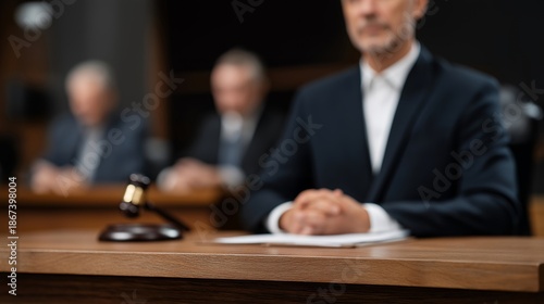 Courtroom bench during an active trial with judge seated, blurred attorneys in foreground, capturing decision-making power and legal hierarchy. cinematic color correction, natural uneven lighting