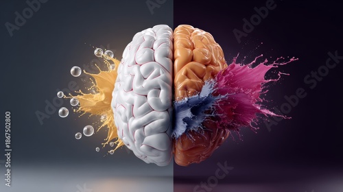 Abstract illustration of a human brain divided into two halves, one side in vibrant colors with splashes, representing creativity and emotion, the other side in neutral tones symbolizing logic and rea