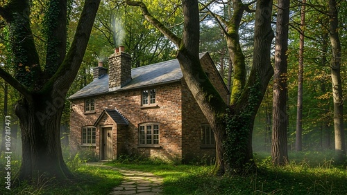 old brick house in forest landscape.