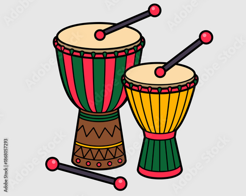 Pair of vibrant hand drums with drumsticks illustration musical instruments percussion drums vector art for educational resources cultural celebration ethnic music festivals creative projects sound an