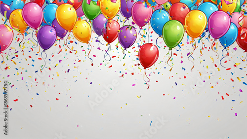 beieinander hängende bunte Partyballons mit dynamischem Konfetti-Effekt