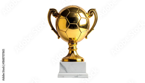 Golden cup with soccer ball atop marble base, ornate handles
