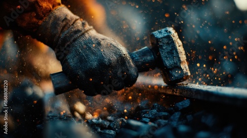 Worker holds hammer while striking metal near tracks during sunset at a worksite
