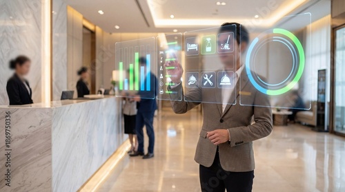 Business professional interacting with a holographic interface displaying charts and circular graphics in a modern lobby reception area.