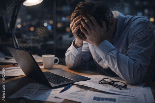 Zestresowany mężczyzna pracujący nocą przy biurku – presja, zmęczenie i problemy zawodowe