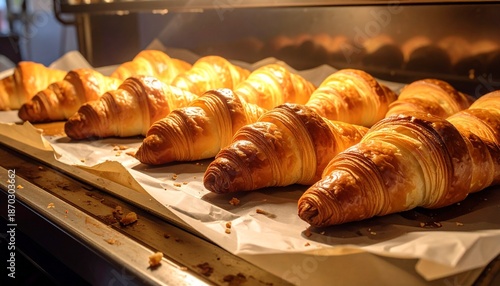 Golden brown croissants baking in an oven, a delicious bakery treat