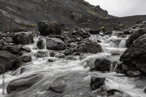 Fluss im isländischen Hochland zwischen dunklen Lava Steinen von einem vergangenen Vulkanausbruch