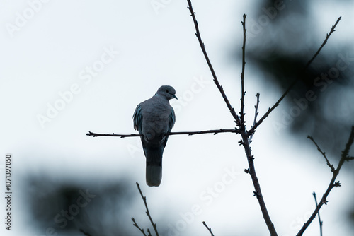 Samotny gołąb grzywacz siedzący na cienkiej, bezlistnej gałęzi drzewa na tle jasnego, zachmurzonego nieba.