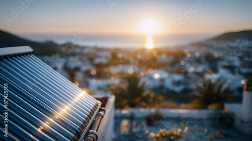 Close-up of a solar thermal panel installed on a residential rooftop, copper pipes and glass collectors visible, sunlight reflecting off the surface, domestic hot water system sust
