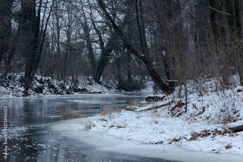 Mała rzeka zimą. Brzegi rzeki porastają krzaki i wysokie drzewa. Ziemię pokrywa warstwa śniegu, powierzchnia rzeki skuta jest lodem.