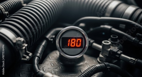 Close up view of a car engine with a gauge displaying the number 180.