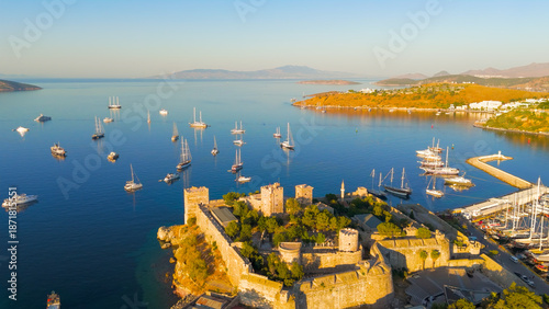 Bodrum, Turkey. Aerial drone view of Bodrum Castle guarding harbor entrance with yachts sailing in Gokova Bay during morning light.. Aerial View