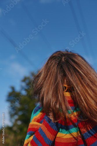Child in colorful striped sweater hides face behind long hair in outdoor portrait, playful moment on a sunny day with blue sky and natural background.