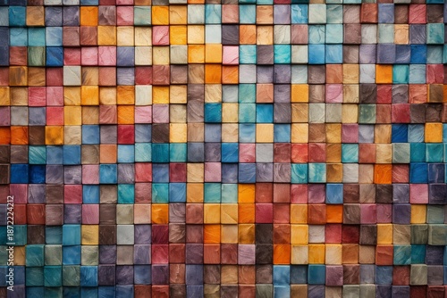 Wooden cubes with various colors and textures forming an abstract mosaic background