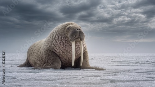 Massive walrus resting on cracked arctic ice, long ivory tusks, wrinkled textured skin, cold polar atmosphere, overcast sky, natural wildlife scene
