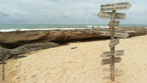 Poste con flechas que indican las distancias a otos ciudades en la playa
