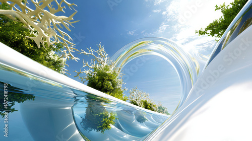 Stunning architectural visualization featuring futuristic landscape with clear water, abstract shapes, and lush greenery, evoking tranquility