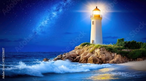 Lighthouse at night, shining bright against a starry sky over restless waves