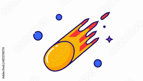 A vibrant, cartoon-style meteor streaks through space, trailing flames and surrounded by celestial elements