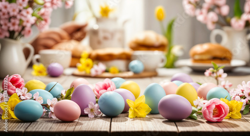 Ostereier in Pastellfarben mit Frühlingsblumen auf Holztisch, festliche Deko für Osterbrunch zuhause