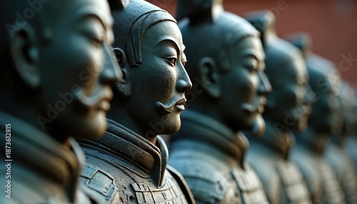 Line of terracotta warrior statues, ancient chinese soldiers, museum artifact detail. Historical figures stand in formation, guarding imperial tomb, ancient China.