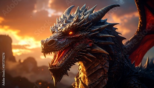 Close-up of a fearsome dragon with glowing red eyes, sharp horns, and detailed scales, against a fiery sunset