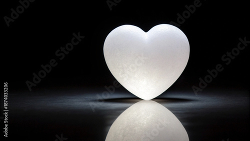 A heart-shaped object, glowing with a soft white light, is positioned centrally against a stark black background