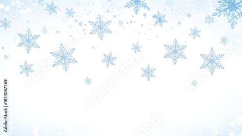 Frontera de invierno con copos de nieve azules sobre fondo blanco. Ilustración horizontal pintada a mano.