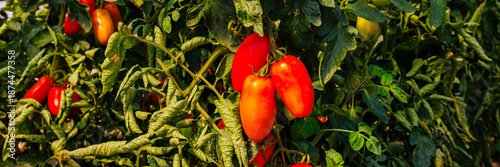 Fresh red tomatoes growing on lush green plants under bright sunlight in a garden setting