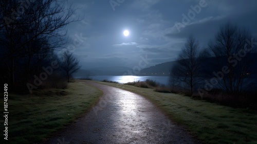 A curved path illuminated by bright moonlight leads towards a tranquil lake with misty hills in the distance under a cloudy night sky