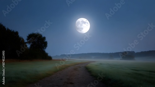 A luminous full moon shines brightly over a tranquil misty rural landscape with a winding path leading into the serene night