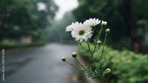 Delicate white flowers with water droplets bloom beside a wet road on a misty rainy day