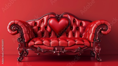 The image showcases an opulent sofa upholstered in a rich red fabric, featuring intricate patterns and textures. The backrest of the sofa presents an elegant heart-shaped centerpiece, flanked by