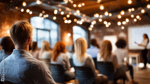 Defocused audience listening to speaker in modern loft conference room during workshop, blurred learning environment, with copy space