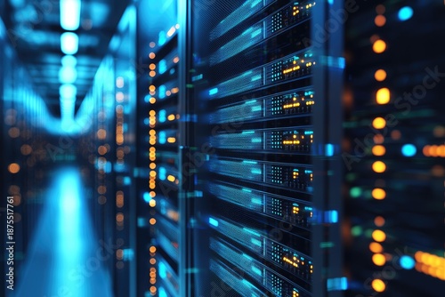 Blue illuminated IT data center server racks with high density cloud infrastructure and glowing indicators, perfect for enterprise computing, digital operations, and modern data security concepts