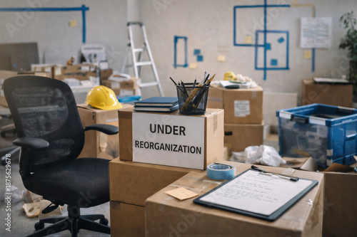 Biuro w trakcie reorganizacji z kartonami, dokumentami i pustym stanowiskiem pracy