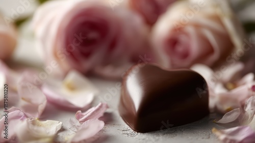Heart-shaped chocolate surrounded by artfully scattered roses, classic romantic composition, elegant and indulgent