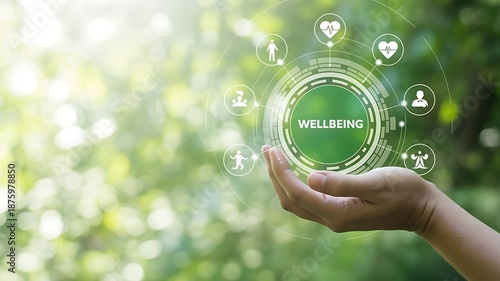 A hand holding a glowing green wellbeing icon surrounded by wellness symbols in a serene natural setting